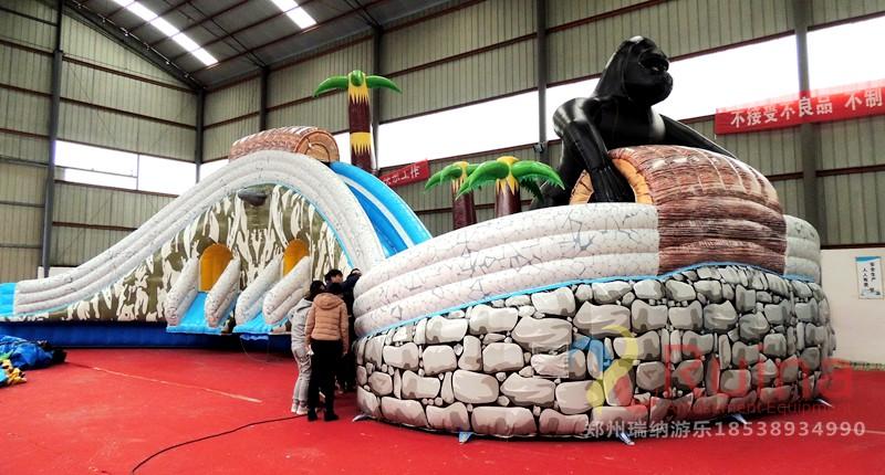 樂園中的三個黑色大猩猩造型被設計的異常逼真,讓游客忍不住會有前去和它合影留念的想法。滑梯的顏色則采用了和大山、巖石一樣的顏色,搭配及其合理,把花果山的造型形象的表述了出來,亦幻亦真,擁有如此優(yōu)美意境的一款全新移動水上樂園,相信將會給周圍游玩的人群帶來一種怦然心動的感覺,讓他們會產生一種前去游玩一番的沖動!