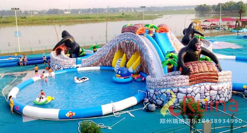 以猩猩林中搬運物品嬉戲為主題,人在林中穿梭,從而達到人景合一的境界;在設計結構上是以三個對稱的滑梯組成,加上噴水的效果,給人以視覺上對稱的美感!每個滑梯下面都配有一個充氣水池,水池中放些水上浮具,如香蕉船、水狗、冰山等,讓移動水上樂園的玩法更加豐富。